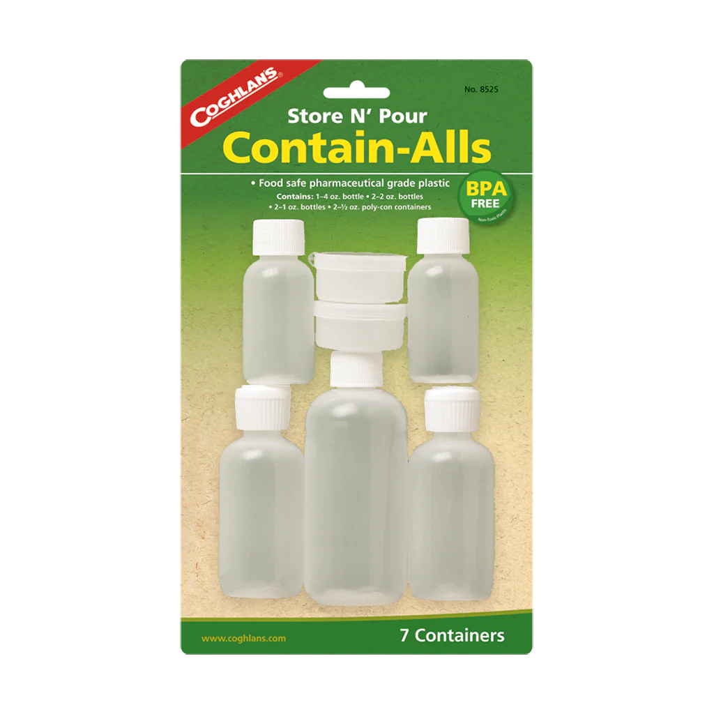 Set includes: 1 – 4 oz. (120 mL) bottle, 2 – 2 oz. (60 mL) bottles, 2 – 1 oz. (30 mL) bottles, 2 – 0.5 oz. (15 mL) poly-con containers.