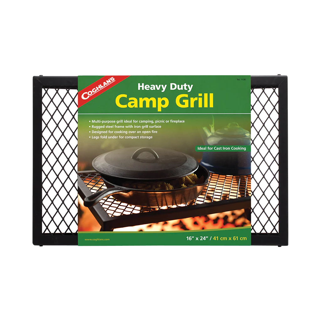This heavy duty camp grill is ideal when using cast iron cookware. The heavy gauge metal frame and iron mesh grill surface are supported by sturdy legs that fold underneath for compact storage.