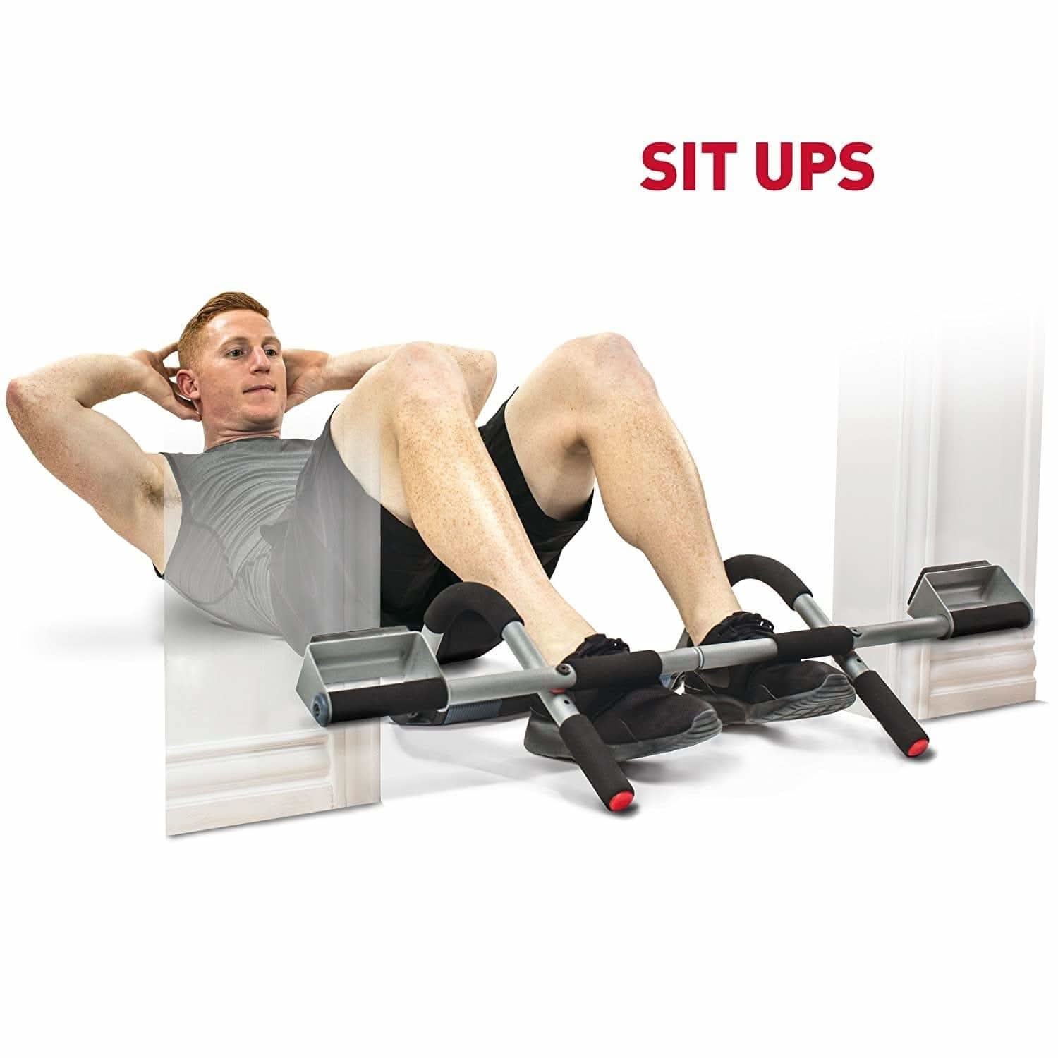 • Portable gym that can be used as a doorway pull up bar or for sit-ups, pushups, and dips; 300 pound weight capacity