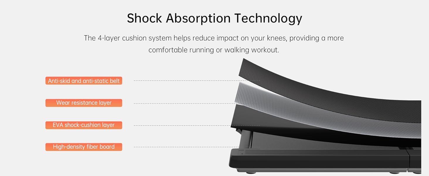 With its upgraded large wheels, moving the WalkingPad across carpets or uneven surfaces feels effortless. Whether you’re rearranging your living space or simply relocating from one room to another, the WalkingPad moves smoothly without any hassle.Enjoy a generous 44 cm x 120 cm running area that provides ample room for a natural stride. The multi-layer shock-absorbing belt minimizes impact on your joints, ensuring a smoother, more cushioned run
