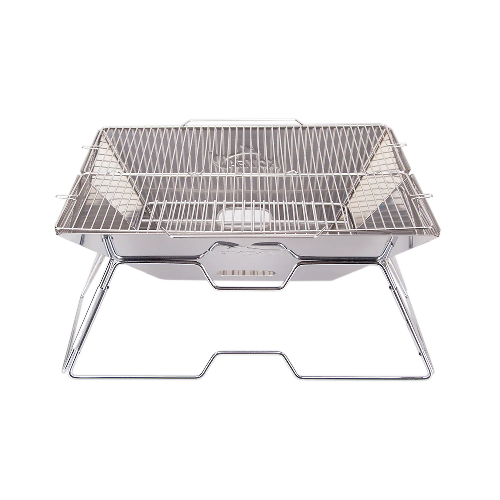 The Kovea Magic II Upgrade Stainless BBQ is a charcoal grill that folds into a very compact package of 20″ x 8″ x 2″ and stows into an included black nylon carry bag. The entire unit with bag weighs less than 7.5 lbs., yet the cooking grid measures a very generous 17″ x 12″ so there is plenty of cooking space for an entire family. No other charcoal grill on the market has these performance features.