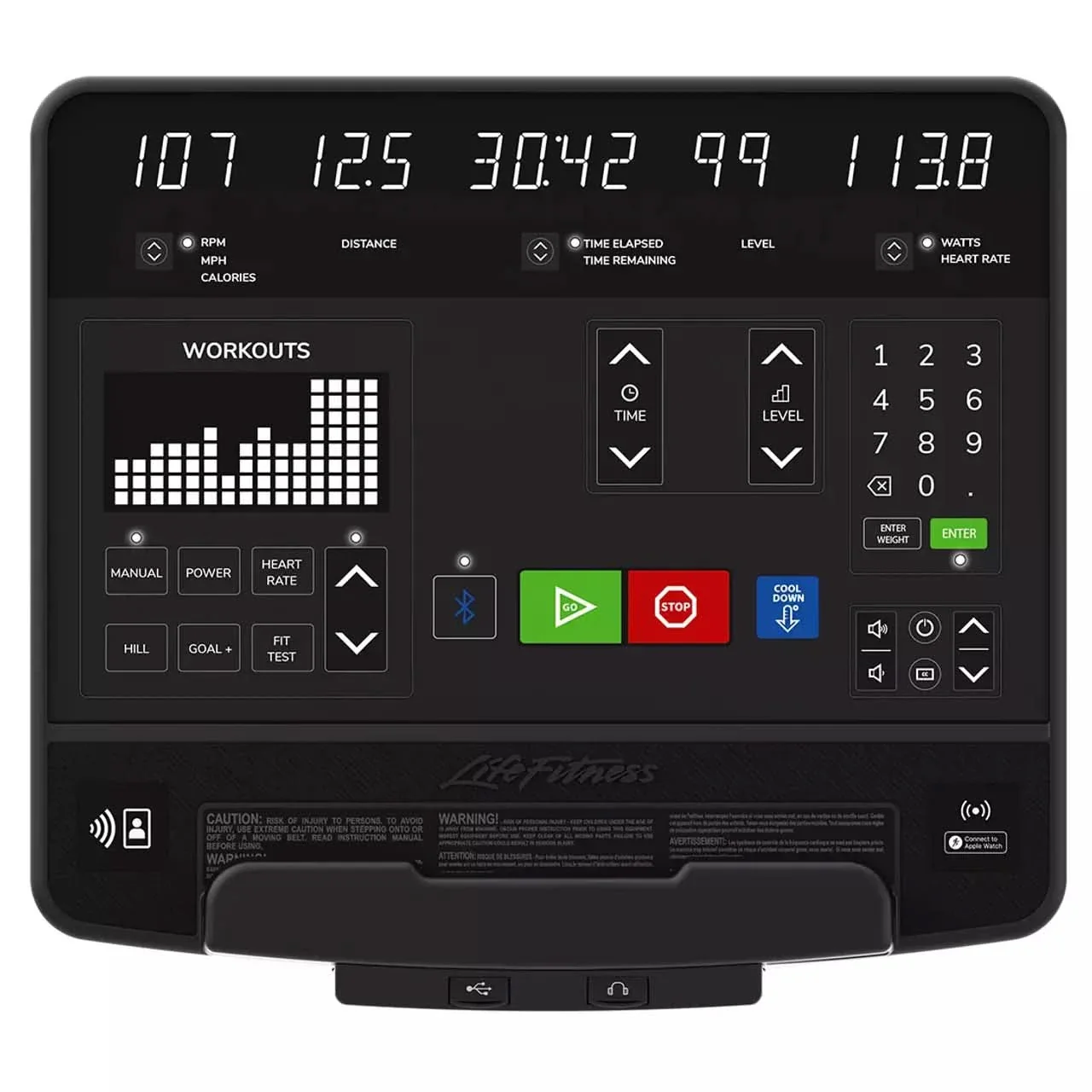 Bright, intuitive LED interface provides clear real-time feedback. Includes Bluetooth connectivity, Apple Watch compatibility, and heart rate telemetry for interactive tracking.