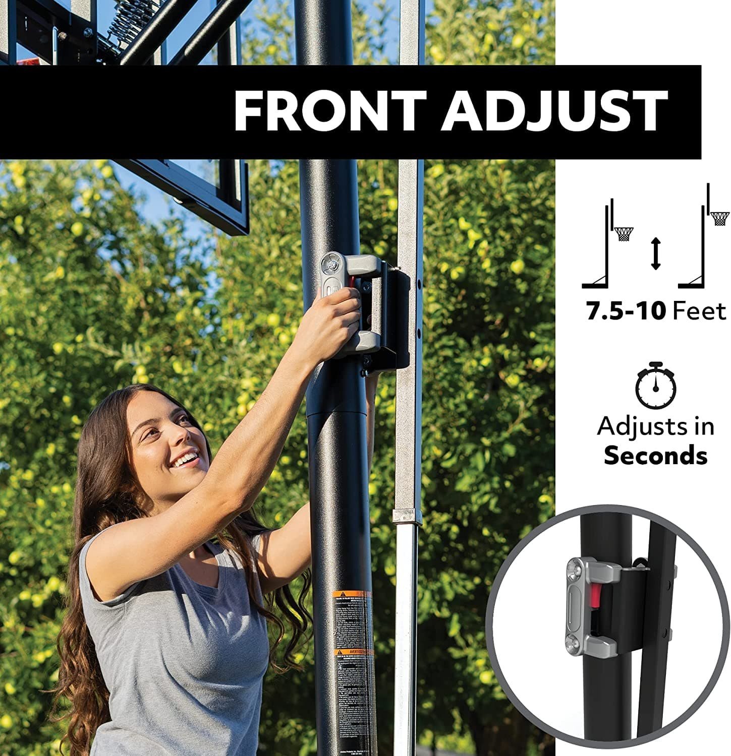 Features Front Adjust height adjustment mechanism; easily adjusts from 7.5 to 10 feet. 3 Piece Powder Coated Steel Round Pole, Adjustment Increments: 6 inches