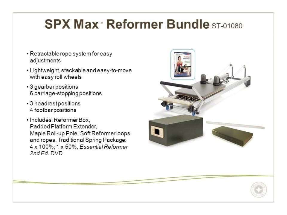 The SPX Max Reformer Bundle is a great option for facilities with limited space or multi-purpose exercise rooms and home users. The product offers a full complement of Reformer accessories to expand programming options.
