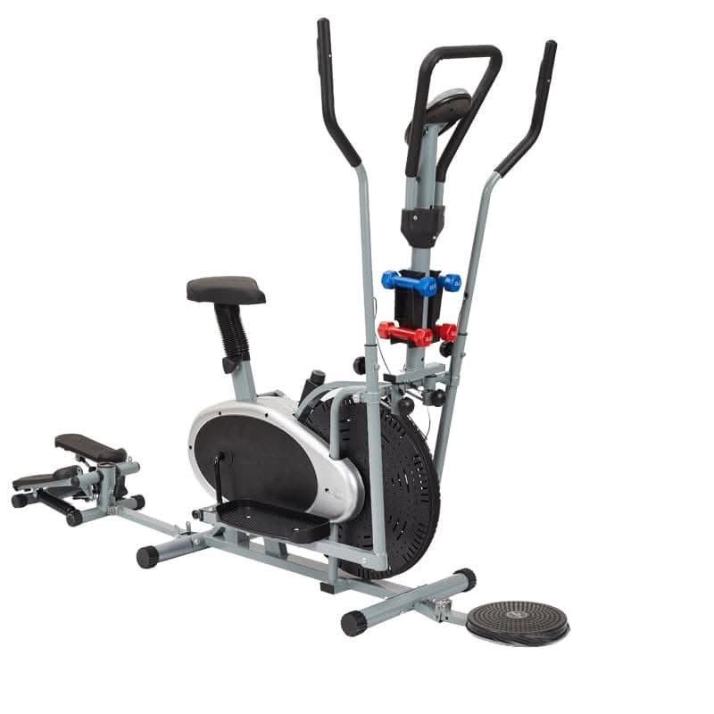 Combines elliptical trainer, stationary bike, twister, stepper, and dumbbells — allowing for a complete upper and lower body workout in one compact machine.