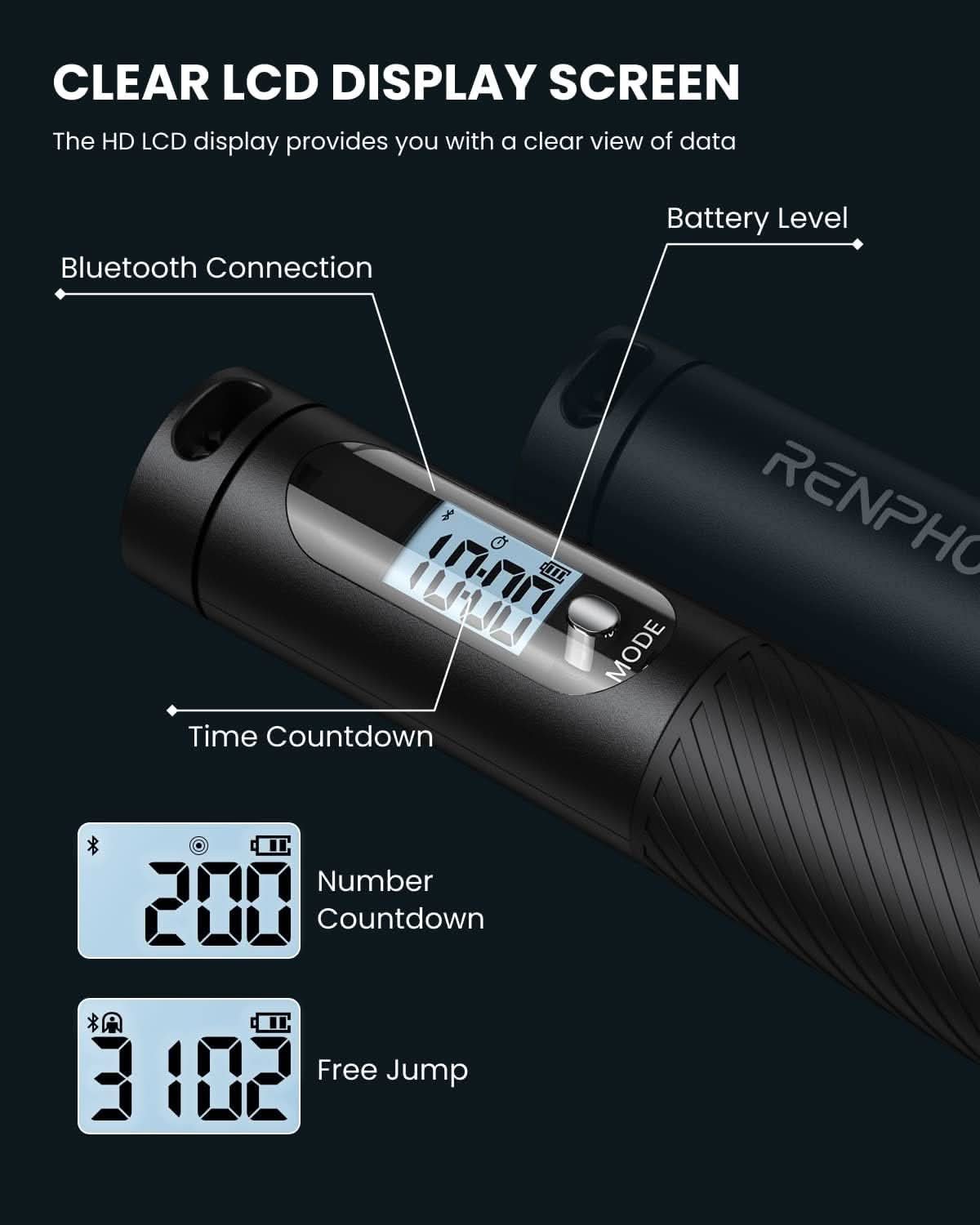 - 【Smart Renpho Health App】RENPHO smart digital jump rope can connect to the Renpho Health App (iOS 7+ & Android 4.3+) via Bluetooth to tell you about the cardio exercise. APP will keep track of your workout data, including jump count, calories burned, time spent jumping etc, to analyze your periodic workout data. It is also a good choice for Christmas gifts.