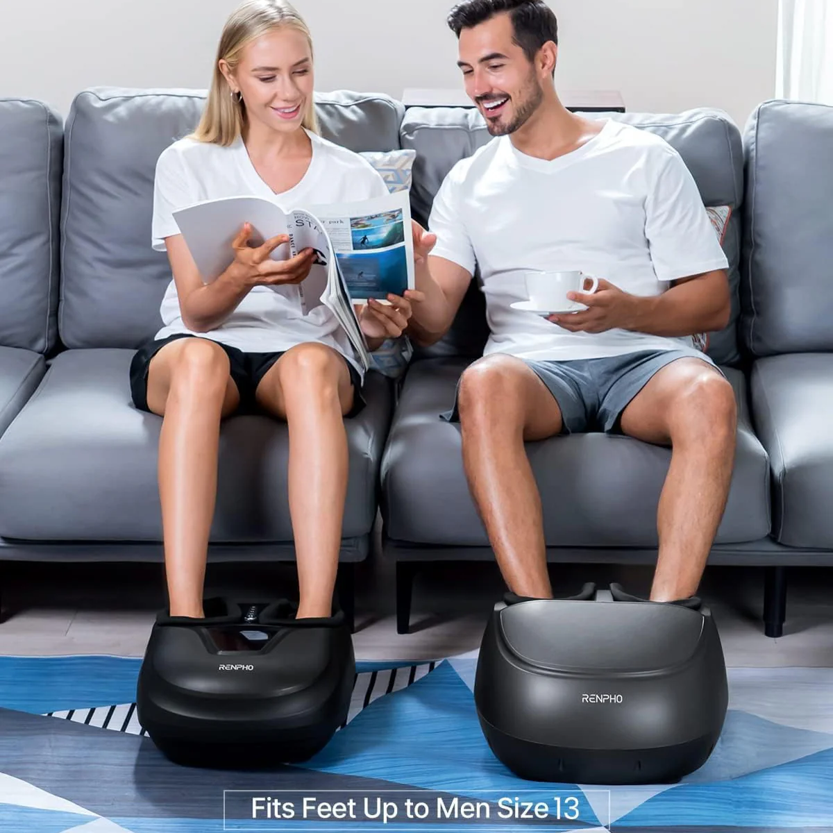 The touch panel of this foot massager machine is easy to control using your foot. Removable washable cloth in the foot chambers helps keep a clean and healthy environment. Fits most people. With its enlarged foot rooms, Renpho foot massager can accommodate most foot sizes, up to men size 12.