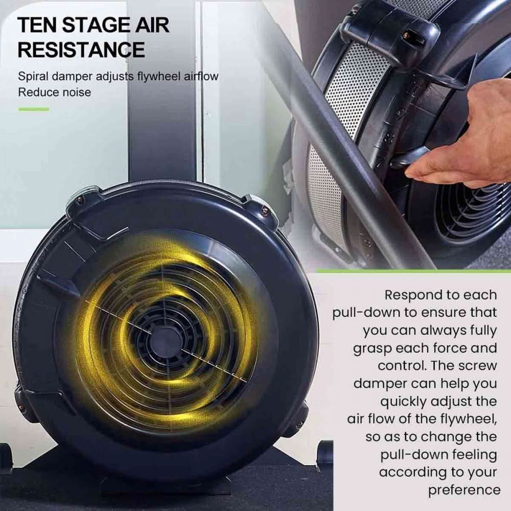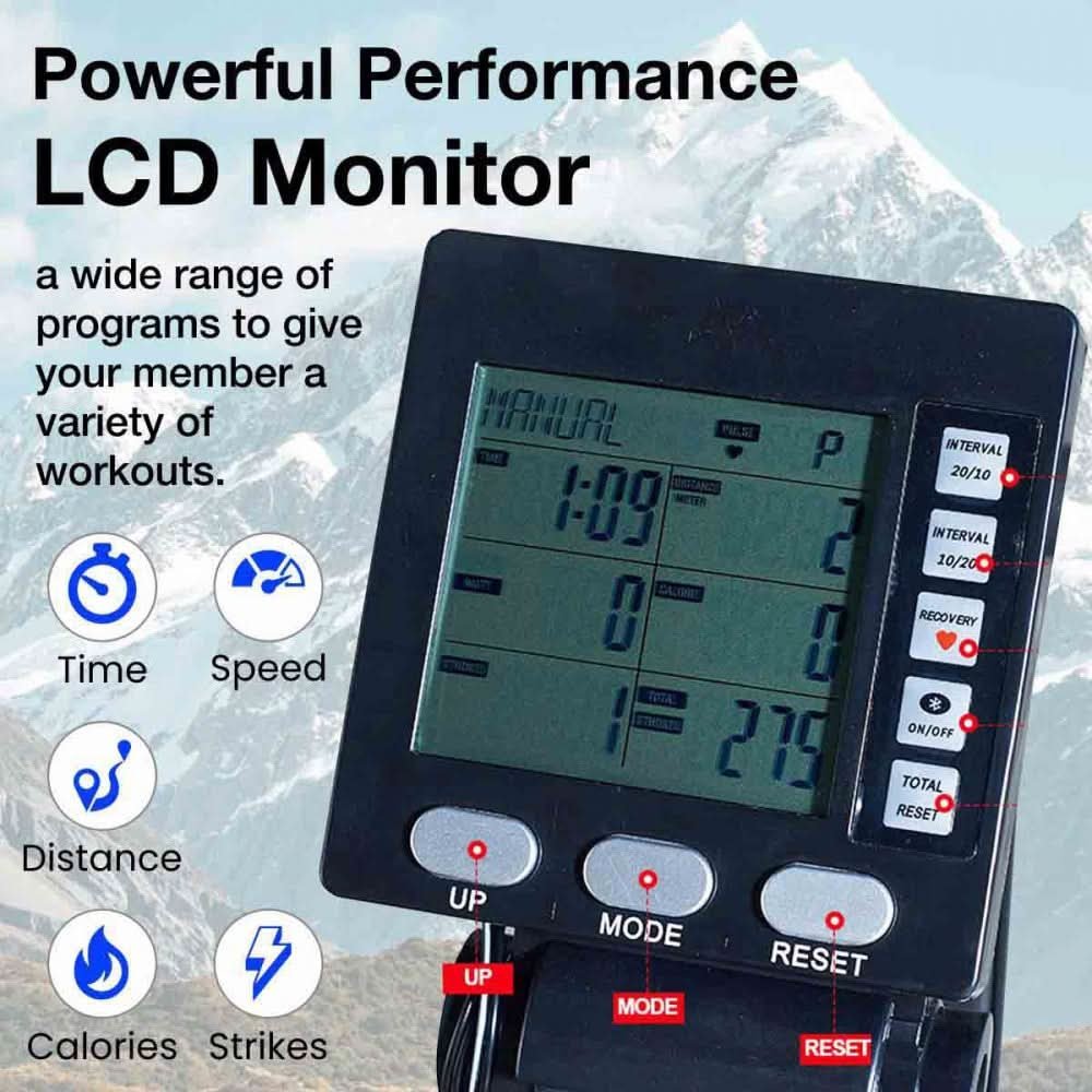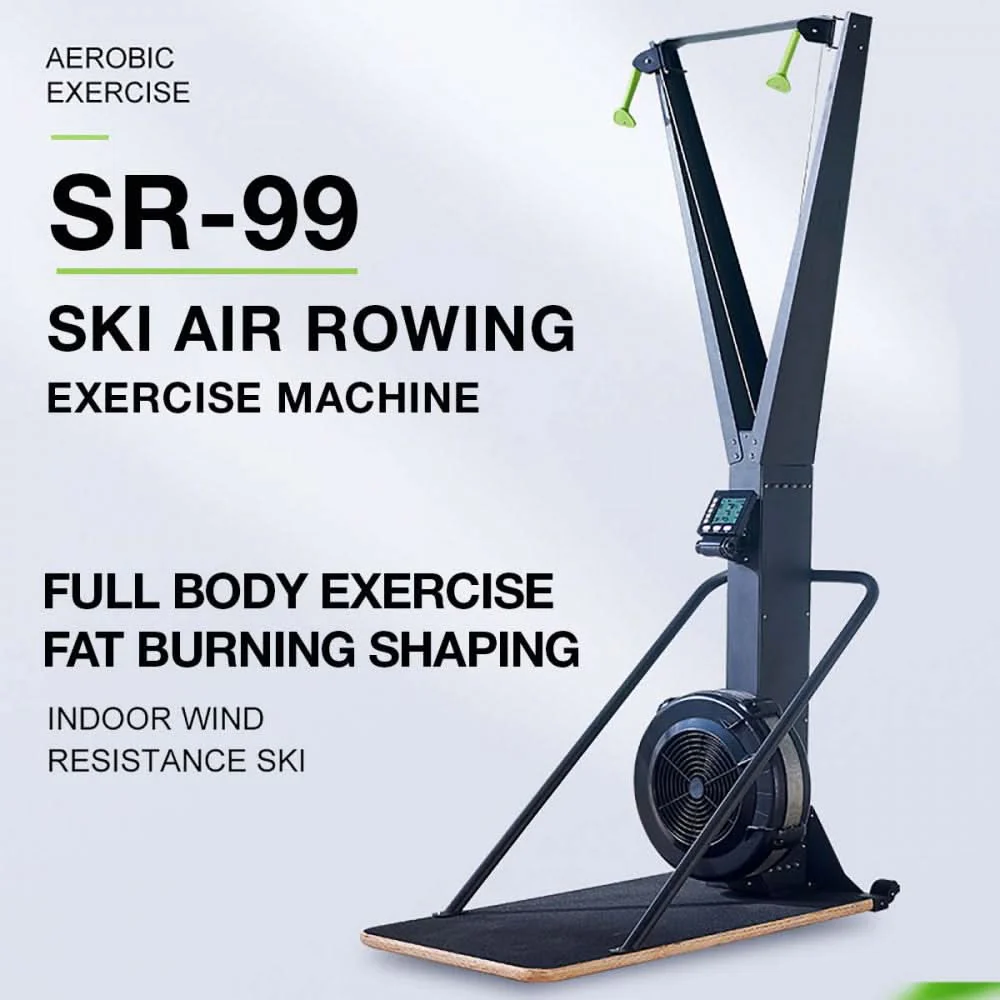 he SR-99 is a top-of-the-line air rowing exercise machine that comes with a floor stand for added stability. It has a steel frame with an ABS cover and 10 levels of resistance, making it ideal for a challenging workout. The LCD monitor displays time, calories, and distance, and the machine has a 20/10 interval program and a recovery program. The black color gives it a sleek, professional look.