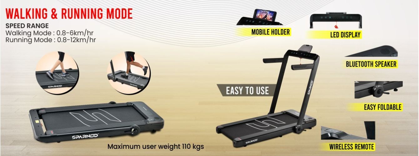2-in-1 Walking-Running Mode – When treadmill riser is folded it becomes under desk/walking pad with speed upto 6 Km/h and when the riser is up it.