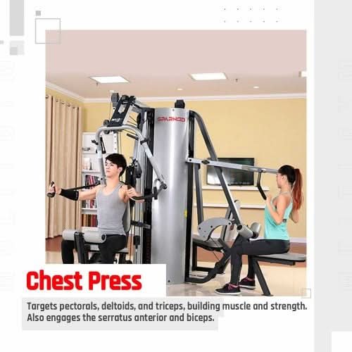 Chest Press: This machine is designed for working the muscles in your chest, shoulders, and triceps. It simulates a pressing motion, helping you develop upper body strength and muscle definition.