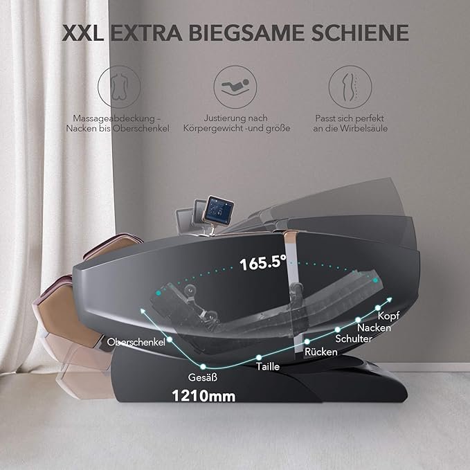 Room capsule massage chair, glider, recliner chair: with 5 cm wall clearance, the model saves space thanks to its innovative sliding and reclining automation. The weightless weighing position is inspired by the NASA weightless design and relieves stress on your spine. Let your body regenerate after a hard day at work using the latest technologies. The lying position also allows higher massage coverage from head to neck, buttocks and toes.