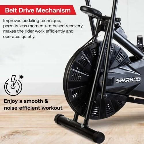 The SAB-05_R Upright Air Bike is a great way to get your workout on at home. It has a belt driven transmission and air resistance for a challenging ride, while the LCD display and console function let you keep track of your progress. The seat adjustment allows you to find the perfect position, while the moving handlebars allow for easy adjustment. The back seat/support allows for easy access to the bike while pedaling.