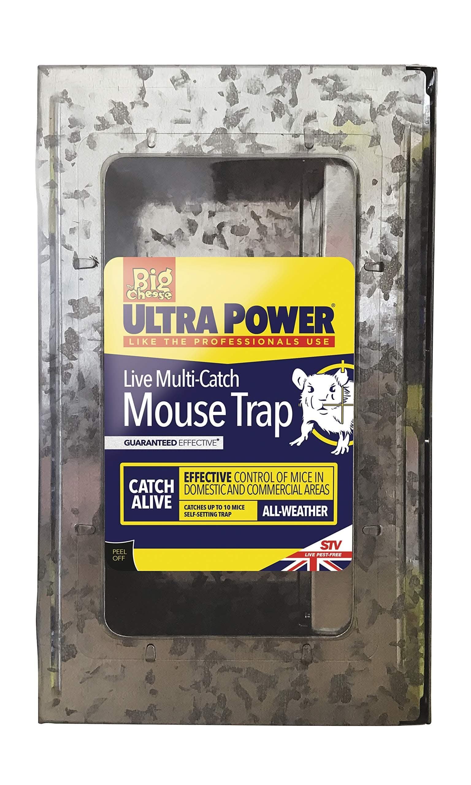 Product Description The Big Cheese Ultra Power Live Multi-Catch Mouse Trap is fully assembled and ready to use. It is suitable for use in indoor and outdoor areas including homes, gardens, farms and commercial premises. It is safe for use in areas where pets and wildlife are present or where conventional snap traps or poison baits may be a hazard, for example in kitchens and food stores. The trap simply requires baiting and positioning in an area where mice have been active. The trap is self-setting and can hold up to 10 mice at any one time. The edges on the trap are machine-finished so captured animals cannot be injured by these. The clear lid allows at-a-glance trap inspections and it is hinged for easy cleaning and live release. The trap’s unique low profile enables it to be sited beneath counters and pallets, as well as within shallow ceiling voids and cavities. Set Contains: 1 x TVS177 self set multi-catch mouse trap