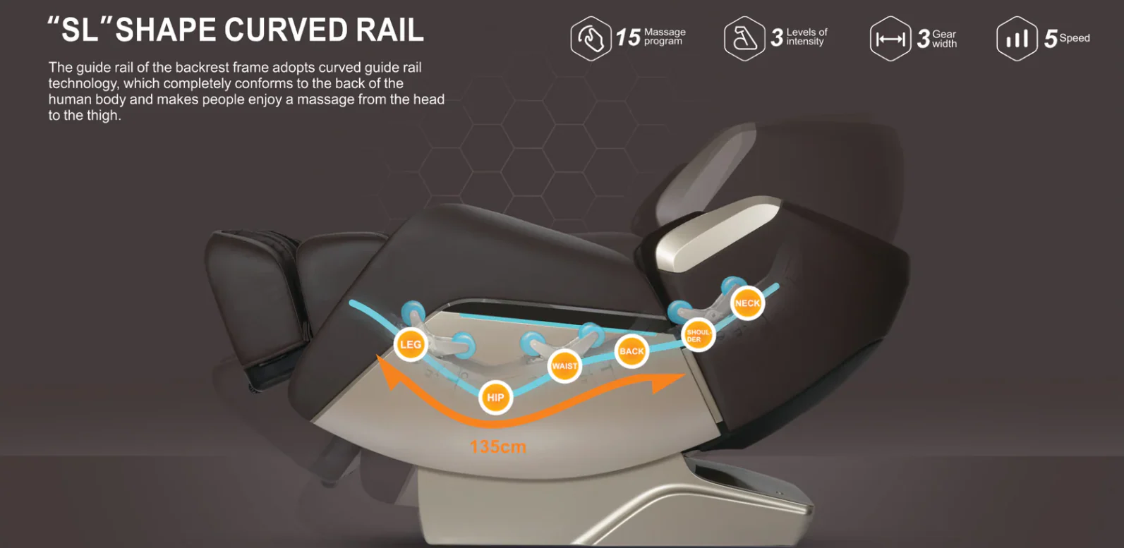 The backrest frame is laid down with slide rail technology to keep the backrest away from the wall at all times, saving space. The backrest guide adopts the curved guide rail technology, which fully fits the curve of the back of the human body, and can enjoy the personal massage from the head to the thigh.