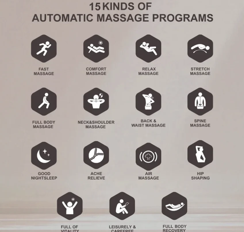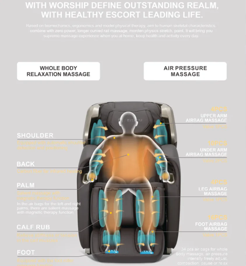 With air pressure massage function: upper arm air pressure massage function (built-in 4 airbags), arm air pressure massage function (built-in 10 airbags), thigh air pressure massage function (built-in 4 airbags), calf pressure massage function (built-in 4 airbags) ), foot pressure massage function (built-in 12 airbags), three-speed air pressure adjustment.