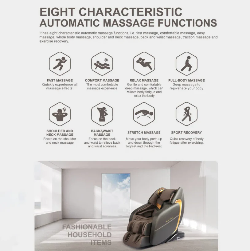 EIGHT CHARACTERISTIC AUTOMATIC MASSAGE FUNCTIONS: It has eight characteristic automatic massage functions, i.e. fast massage, comfortable massage, easy massage, whole body massage, shoulder and neck massage, back and waist massage, traction massage and exercise recovery.