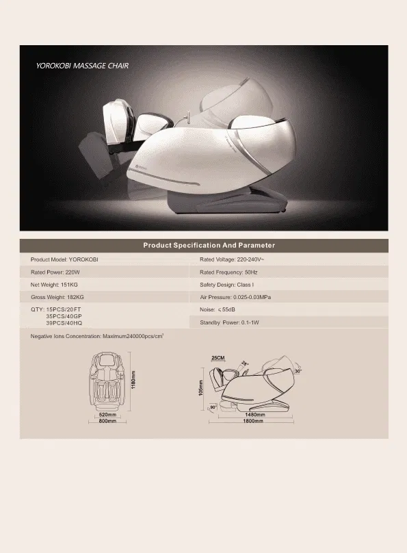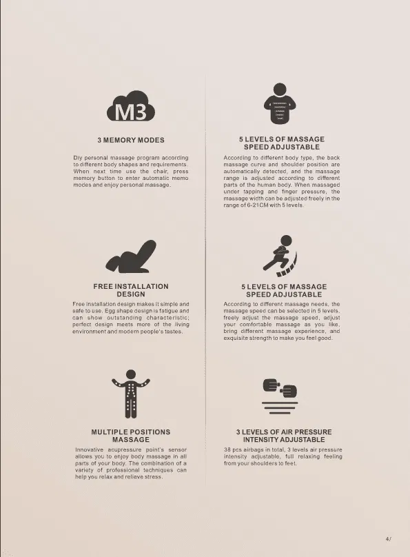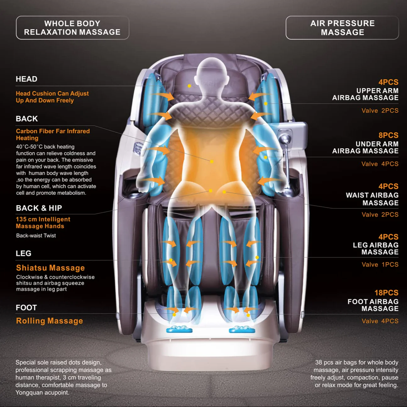 Full body air massage, 38 air Bags surrounding, eliminates fatigue. | Heating Therapy (back), 40°C-50°C.