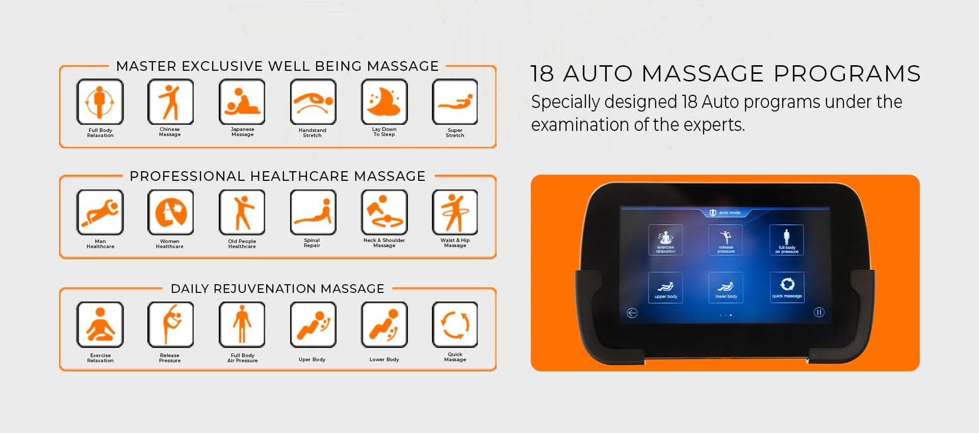 • Full body Relaxation massage • Chinese massage • Japanese massage • Handstand Stretched massage • Lay down to Sleep massage • Super Stretch massage • Men Healthcare mode • Woman Healthcare mode • Old people Healthcare mode • Spinal repair massage • Neck & Shoulder massage • Waist & Hip massage